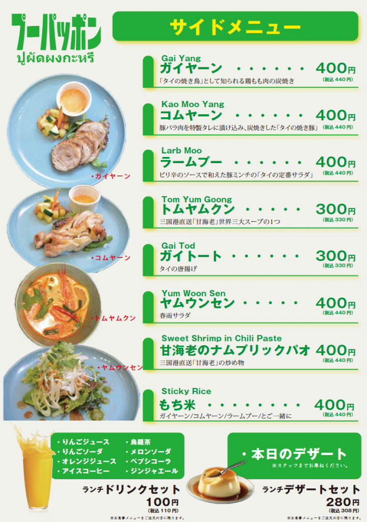 人気のトムヤムクンから肉料理の定番、ガイヤーン。特におすすめのガイトート(唐揚げ)はオーダーを受けてから漬け込んだチキンをカリッと揚げ、中はしっとりと美味しく仕上げてます。